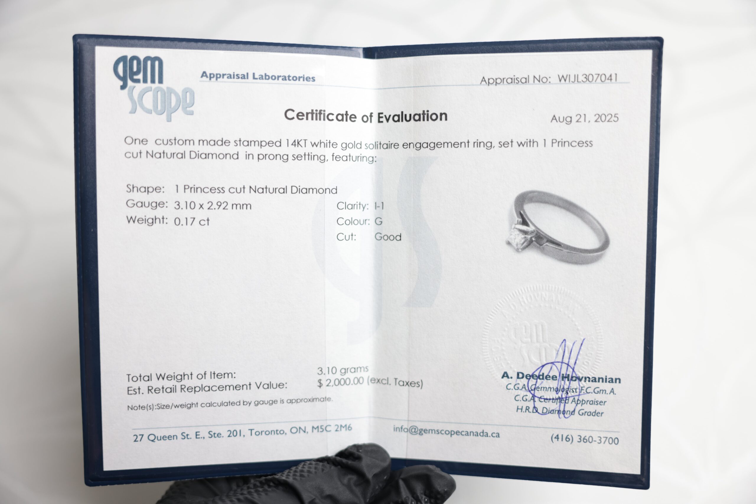 Specs: 14K white gold, 3.10 g, G/I-1, Good cut, size 7 (resizable by request).