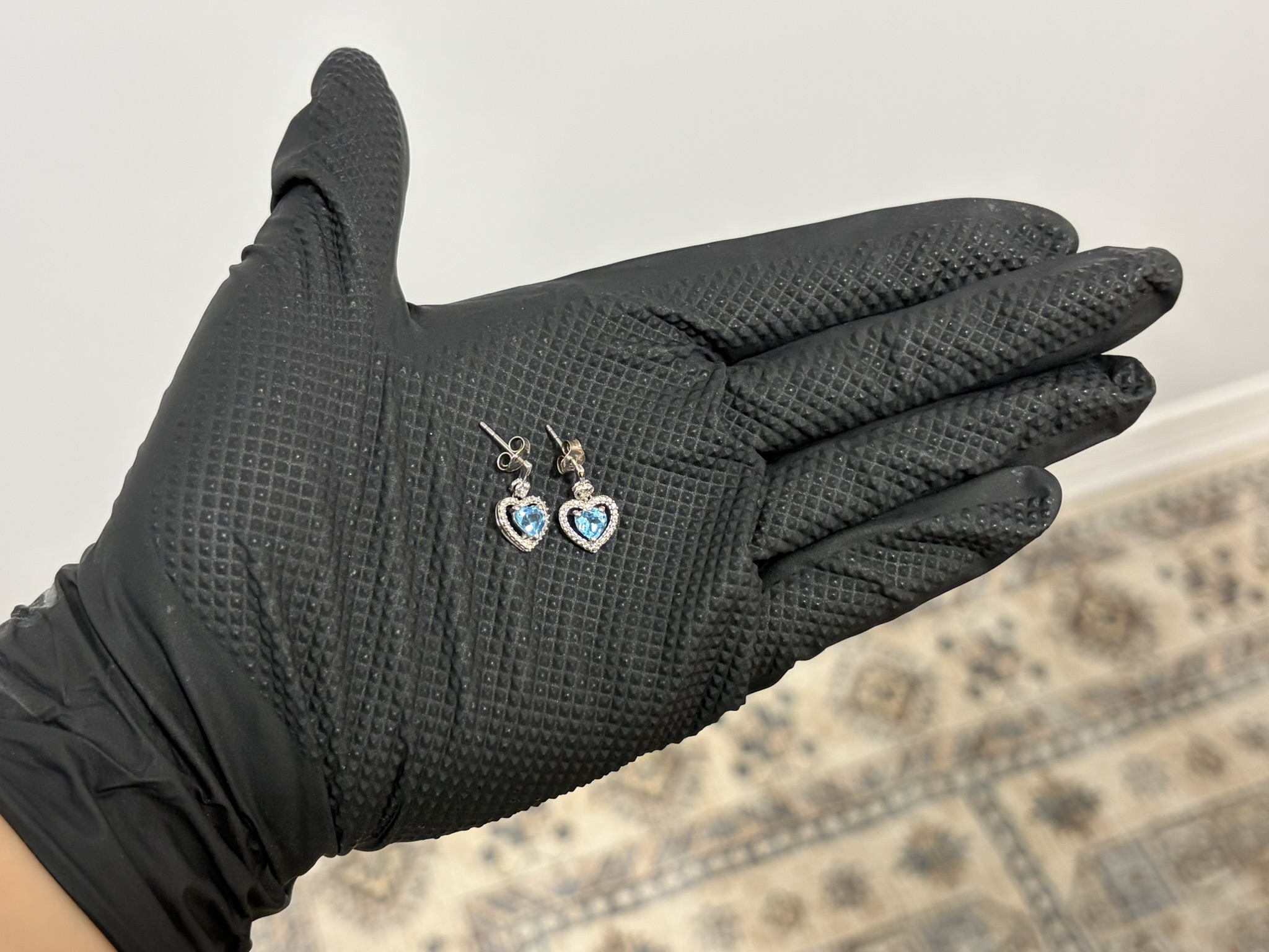 Remove the pieces before swimming, showering or exercising. After wearing, gently wipe the Blue Topaz Heart Necklace and Earrings Set with a soft, lint free cloth to remove oils and keep the silver shiny and the stones clear.